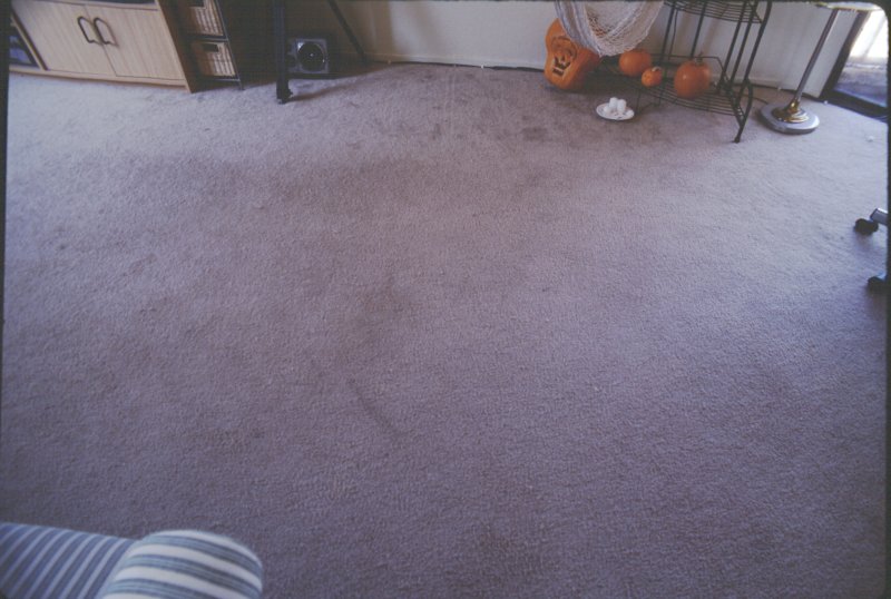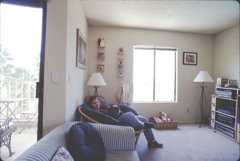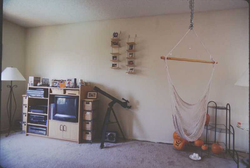 That gave me 95% of the results I wanted. Although the stitching was fairly accurate, it was not exactly perfect and some things inevitably didn't quite match up along the seams between two neighboring images. It took me a couple of hours of fussing with Gimp to straighten these out to my satisfaction. (The results still aren't perfect; you can see some of the artifacts if you look closely enough.) Some of these problems are due to imperfections in the wide-angle lens I used to take the pictures (this particular lens seems to distort things a bit too much on the edges of the frame, and things on the edges are significantly too dark), and some due to the fact that even on the tripod, the camera didn't exactly rotate around the nodal point of the lens, so there's a bit of unwanted parallax between different images--especially on things near to the camera like the couch in the foreground and the bookshelf behind the camera.